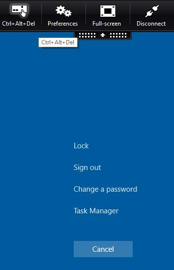 När du kommit in i fjärrskrivbordet, titta högst upp på skärmen i mitten. Där finns en svart meny och du trycker på ikonen Ctrl+Alt+Del