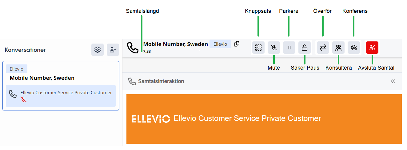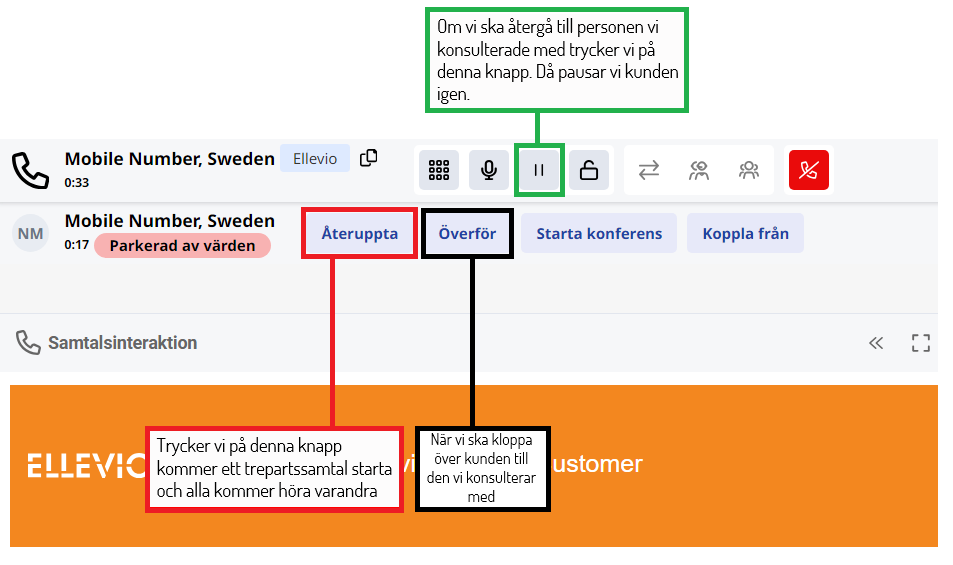 Om vi använder oss av parkera för att återgå till kunden ser det ut som följande med förklaring vilka knappar som gör vad.