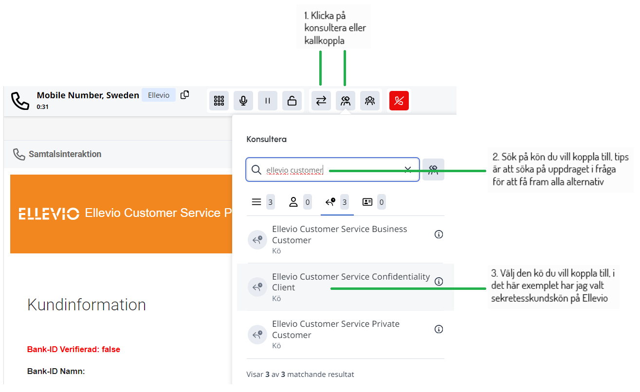Se nedan för förklaring hur du kopplar ett samtal till en specialkompetens (som specialkompetens räknas Kravgruppen, Specialgruppen, Sekretess, 2nd line och Felanmälan) Samtalet startas automatiskt när man trycker på kön i steg 3.