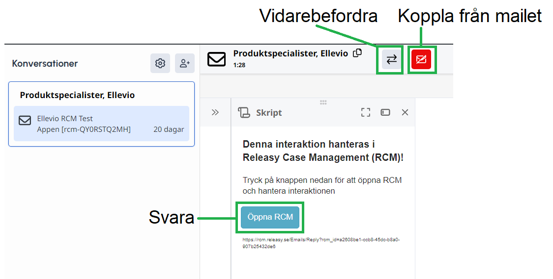 - Efter att det besvarats i RCM, så kopplar man ifrån mailet genom att trycka på "Röda knappen".