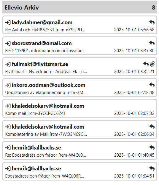 - Öppna en ny flik i webbläsaren med RCM Ellevio Arkiv och sök ofiltrerat på mailets rcm-xxxxxxxx.